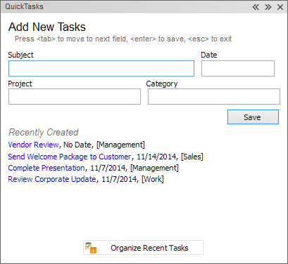 QuickTasks allow the easy entry of tasks in batches or individually throughout the day as you are working in Outlook or other applications. Quicktasks is launched from the button in the toolbar or the Dashboard. Once open, the QuickTasks window stays above other windows so that it is easily accessible.
